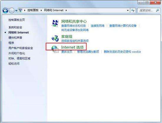 1.依次点击“开始”→“控制面板”→“网络和 Internet”,点击“Internet 选项”。如图所示: