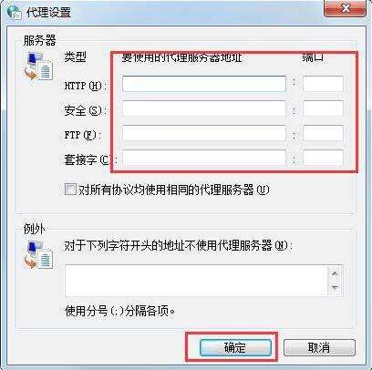 4.在弹出的“代理服务器设置”对话框下,设置不同类型的代理服务器(如 HTTP、HTTPS 或 ftp)。然后输入“要使用的代理服务器地址”,点击“确定”按钮即可。如图所示: