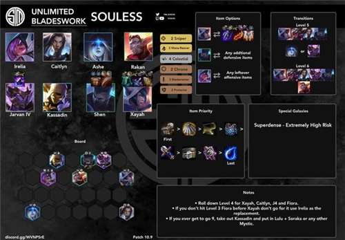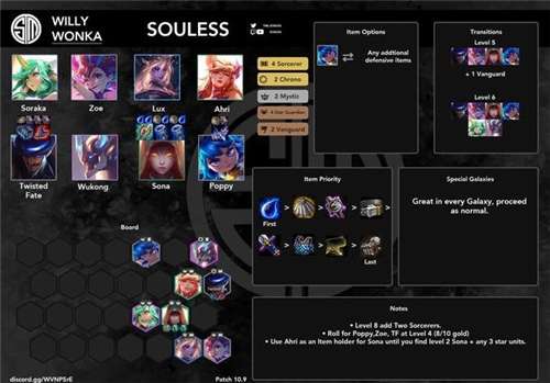 除了常规的赌霞、剑姬和王子外,Souless的打法顺带还赌女警,前期组成2未来即战力很强,不至于掉太多血;然后女警虽然施法时间长了点,但一枪一个小朋友还是很爽的;国服另一种常见打法是不赌女警,走连败甚至空城的打法,后期直接用锤石,风险较大。
