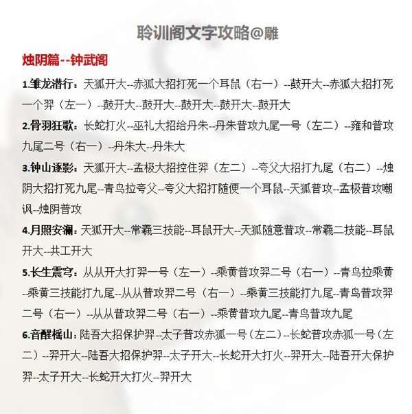 5、长生震穹:从从开大打羿-号(左一)乘黄普攻羿二号(右一)--青鸟拉乘黄-乘黄三技能打九尾-从从普攻羿二号(右一) -乘黄三技能打九尾--青鸟普攻羿二号(右一) -从从普攻羿二号(右一) -乘黄普攻九尾-青鸟普攻九尾
