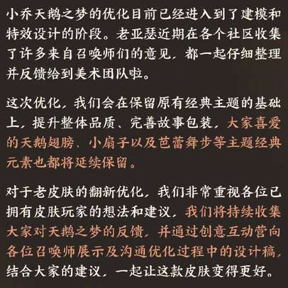 王者荣耀小乔天鹅之梦优化很久了,目前还没有正式曝光优化完成,但是在最新的策划答疑中,官方确定了小乔天鹅之梦优化的一点信息,现在就和小编一起看看吧: