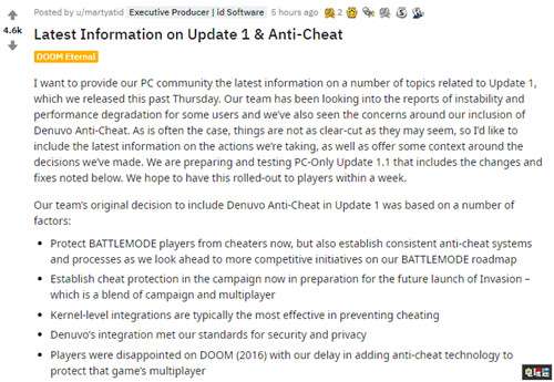 在5月15日,贝塞斯达对游戏进行了更新,添加了PC玩家们很熟悉的数字版权保护厂商Denuvo的反作弊程序,以应对在线模式中的作弊问题。而这一举动引发了大量的游戏问题,包括Linux无法开启游戏,读取时间增长,游戏崩溃等问题。并且虽然贝塞斯达表示D反作弊程序可随时卸载,但是玩家卸载程序之后进入游戏前依旧必须下载D反作弊不然无法启动游戏,而D反作弊程序在PC上权限最高,这对于玩家的个人隐私也造成了威胁。于是原本Steam好评连连的《毁灭战士:永恒》在5月15日之后就经历了过山车似的评价下滑。