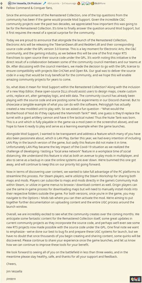 对于很多PC游戏来说,mod可以很大程度上的延长游戏的生命周期。不过对于新游戏也有越来越多的官方自己做“付费”mod的趋势,而作为一款比很多玩家岁数都大的老游戏重制,《命令与征服:高清合集》高清版虽然还没有发售,但是EA已经宣布将公开《命令与征服:高清合集》的相应源代码,来助力社区mod开发。