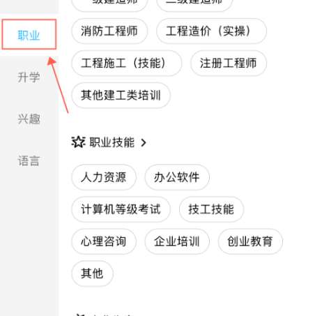 登录成功后,点击下面的“找课”,然后点击左侧一个栏目,如“职业”,然后选择一项子项,如下图所示