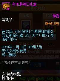 开启后,可以获得1个[期限]时间引导石神秘礼盒(20~50)和5个夜市鲜肉包。