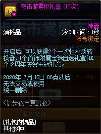 开启后,可以获得3个一次性材质转换器、1个特殊装备附魔宝珠自选礼盒和1个12周年夜市硬币礼盒