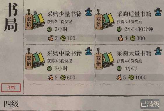 书局每天的前2次采购都是双倍奖励。双倍指的是数量翻倍。(比如初始4级随机奖励4-6本书,双倍随机奖励8-12本书)(所有城市累计)。