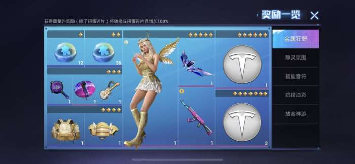 点击领取奖励,可以领取当前扭蛋等级所对应的奖励,领奖时可以选择领取道具或者是扭蛋碎片,迫具奖励不会里复获得且每次只会按照平均权重随机获得一个,如果扭蛋等级的道具都拥有,则领取的扭蛋碎片数量提升100%;六星和七星的特斯拉兑换徽章奖励只能各自领取一次,领取奖励后则本轮结束,积累的扭蛋等级将被清空。