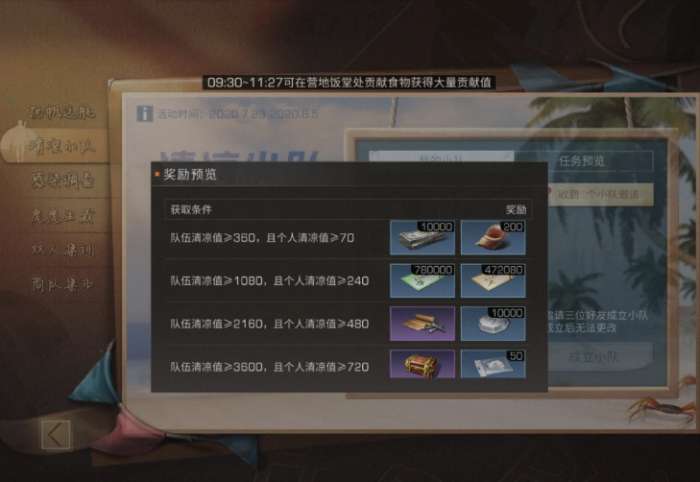 首先是清凉小队活动,这个活动的奖励还是很好的,有配方残页,新币、集训币、大量的战斗熟练度和采集熟练度以及配件零件。