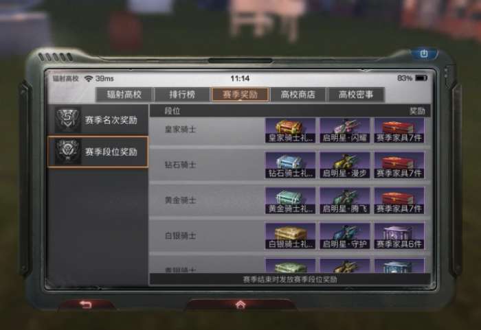 这次的辐射高校家具不是所有人都可以获得了,之前的辐射高校家具只要你段位到达白银就可以获得所有家具,现在开始分级了。段位越高,获得的高校家具越多,最少要到达黄金段位才可以获取所有的家具。