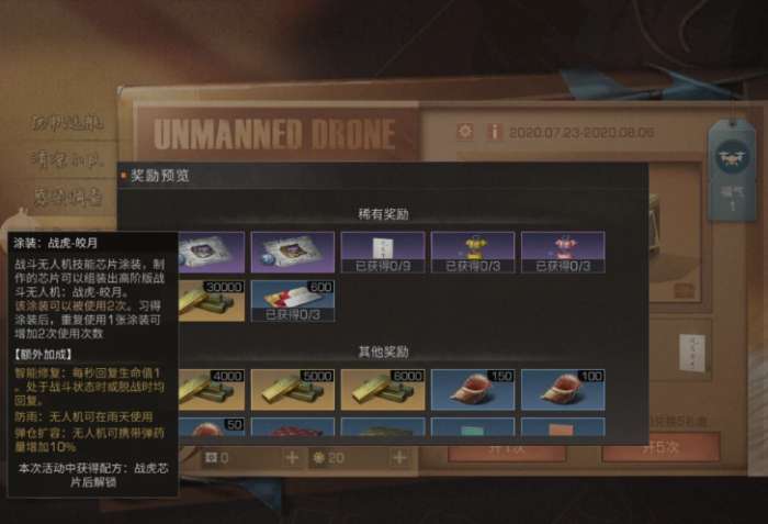 接下来是新的战斗无人机——高级版战虎无人机,这个无人机的涂装有一个新的技能,只能修复,每秒回复一点生命值,相当于一个回血甲。