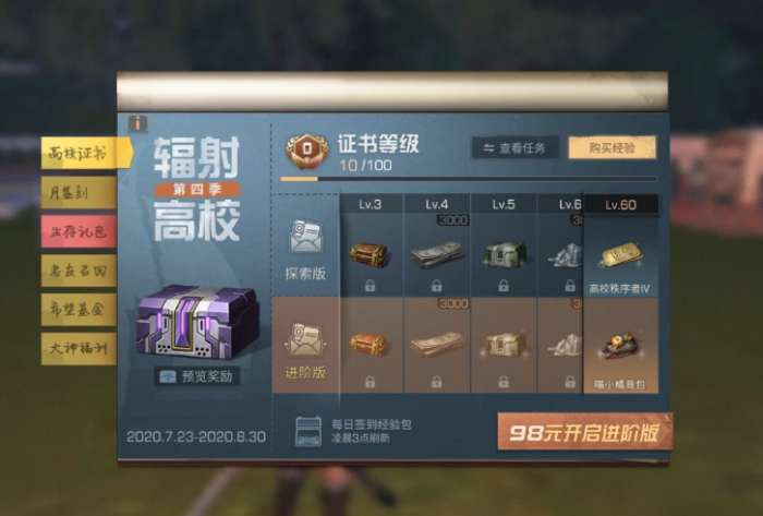 这个高校证书玩过王者荣耀的小伙伴们应该都很熟悉了,因为它类似王者荣耀中的战令玩法。这次的高校证书也是分为探索版和进阶版,奖励很丰厚,但是售价有点贵,要98块钱。