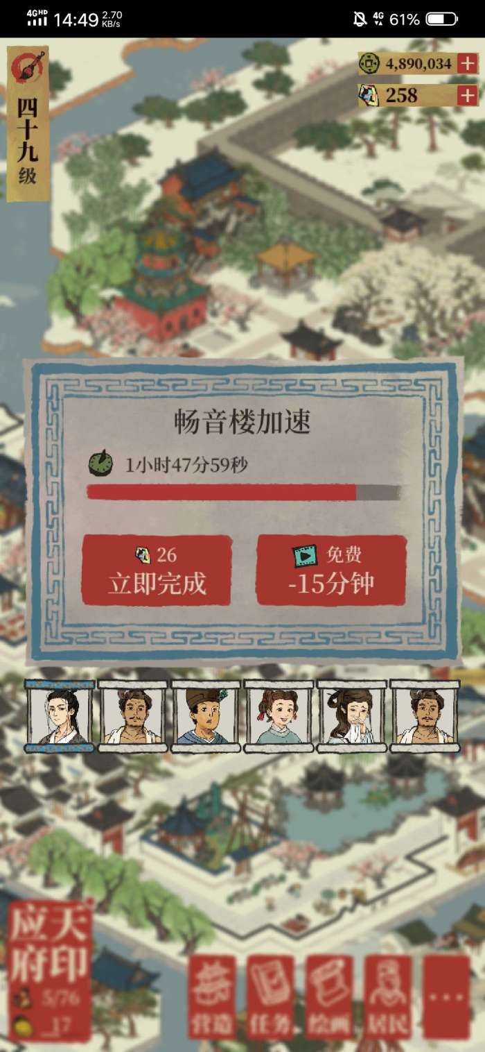 如图所示,利用一个建造特级的人物(文征明首选,唐伯虎,刘伯温,魏九天均可),装备满级打神鞭,由于那几个人初始建造都有790左右,所以最后得到的加成都在77%左右,但是如果是文征明那就是(1-77%)*67%=15.4%,只需要原始时间的15%左右,以畅音楼为例,原本12小时,现在只需要一小时48分。如果有时间再看看广告,轻松获得2893点经验,属于轻松护肝高收益了。如果资源多的还可以去刷木牌坊,没有建造时间,就是比较吃资源,收益也比较低70-80的样子。