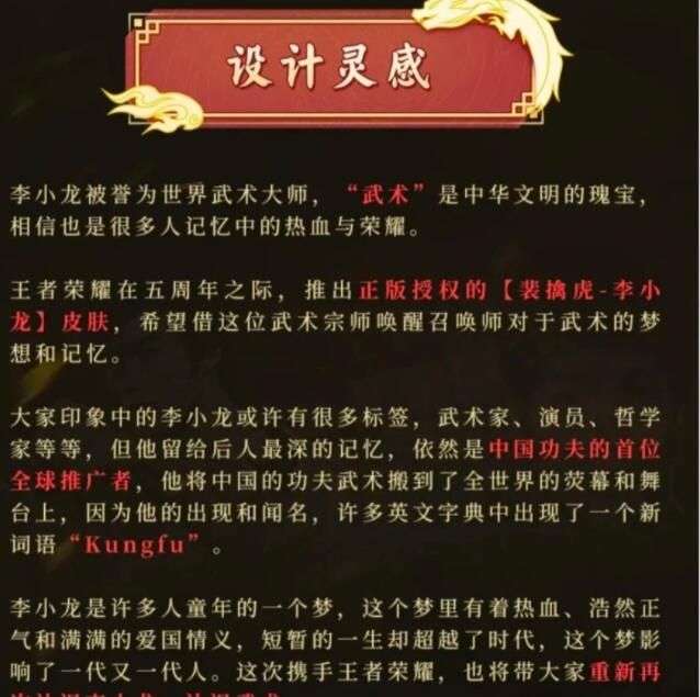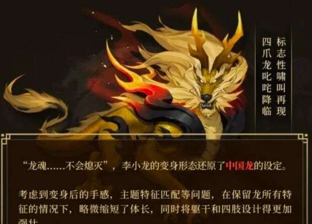 【角色形象设计】:皮肤选择了李小龙的经典造型“黄色连体衣”。 变身形态则还原了中国龙的设定。这也是本次皮肤联动希望传达给大家对于传统文化的现代表达。