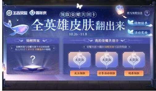 在11月1日的【王者共创 荣耀盛典】中公布【锦鲤图案】后,大家开启荣耀共创卡,并根据开出的【锦鲤图案】数量获得奖励。