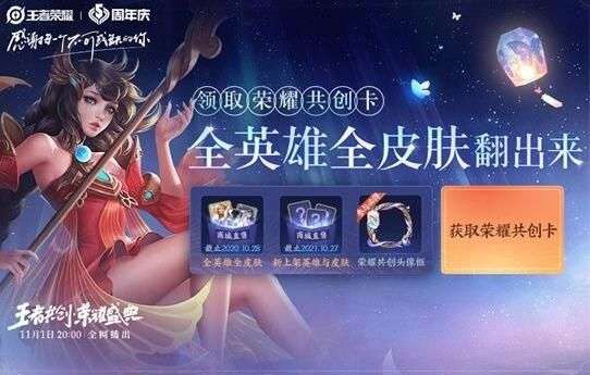 “荣耀盛典 翻出全英雄皮肤”活动已开启。在活动期间10月26日-11月8日,关注【王者共创 荣耀盛典】、分享活动大图、盛典当天前往游戏内右下角【赛事】观看盛典,可以分别获取1张荣耀共创卡(开奖后无法领取)。