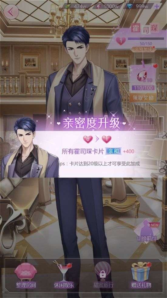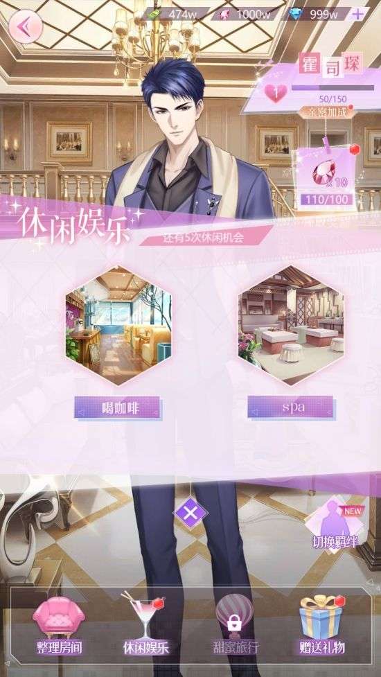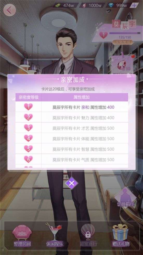 在羁绊中,送礼,休闲,整理房间都可以提高男主的亲密度。其中,整理房间一天只有一次,休闲娱乐每天有5次机会,赠送送礼则是刷亲密的最快捷的方法~