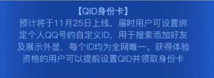 QID 具有唯一性,一个 QQ 号仅能对应绑定 1 个 QID;QQ 号一旦发生冻结、回收等状态变更,QID 同步处理。QID 确认设置后 , 30 天内仅能使用改名卡修改 1 次,非 SVIP 用户不可修改。修改 QID 后 , 原 QID 保留 3 天可赎回 , 超过 3 天即释放 ; 赎回原 QID 需使用改名卡。
