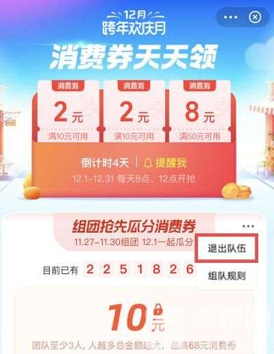 支付宝12月消费券咋退队,在12月1日,支付宝新开启的消费券活动,在这个里面可以用和自己好友做任务的机会,组队之后该怎么退出呢,有什么方法退出,下面就来介绍下支付宝12月消费券怎么退队。