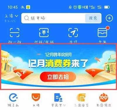 1、首先打开手机支付宝应用,在首页的最上方找到活动入口,点击进入12月消费券活动页;