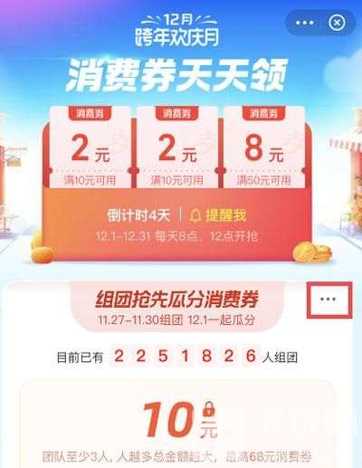 2、进入12月跨月欢庆月消费券天天领页面之后,可以看到当前自己的组队情况,点击右上角的三个点【更多】;