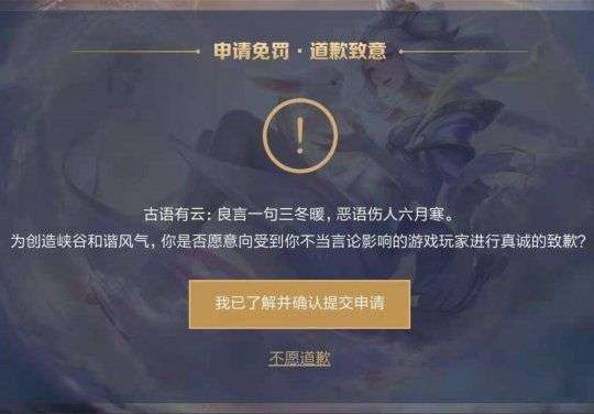 王者荣耀游戏里面的道歉系统适用于在对局结束后被队友或敌方举报有不当言论或挂机等情况造成的惩罚情况下,在该情况下玩家会有一个道歉的选项出现,玩家可以选择点击道歉选项,填写一封道歉信从而发送给举报你的玩家,之后对方会收到是否要原谅你的提示,如果对方选择原谅的话那么你的惩罚就会取消掉,如果对方选择不原谅的话,那么惩罚依旧执行,不过小编还是建议玩家绿色游戏。