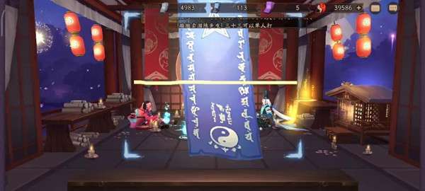 2、起点方面一定要保证在这个红布的下面,也就是神乐的头上,最好是垂下来的这个红穗的地方开始,然后从左向右横着画上一条线,保证穿过从下往上数第四个符咒字,一直画到右边红布的边缘停手。