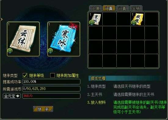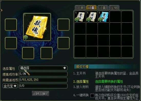 另外,若玩家对蓝、金品质天书的基础属性不满意,也可以通过天书转属功能将不满意的属性替换,操作方式与天书强化一致。如果转属成功,则系统将重新生成一条基础属性用来替换玩家指定的基础属性,该基础属性的数值也会重新生成。不仅如此,玩家也可以使用天书继承功能,将主、副天书的的等级互换,帮助玩家快速完成天书升级。