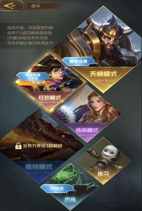 中间最醒目的战斗就是玩家们进行各种对战的地方喽!里面的子版块也是很丰富的,有天梯模式,狂欢模式,休闲模式,竞技模式,练习和历练。其中天梯模式和休闲模式就是我们常说的排位和匹配模式了;狂欢模式则是可以用两个势力混合牌组进行娱乐对战,可以考验玩家们对各个势力的理解和配合程度;竞技模式需要全势力3级才能解锁,是考虑到此模式需要玩家们对每个势力都有一定的了解才能愉快的玩耍,条件略显苛刻但也可理解官方的良苦用心了;练习和历练比较简单,相当于新手教程了。