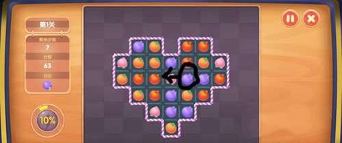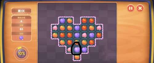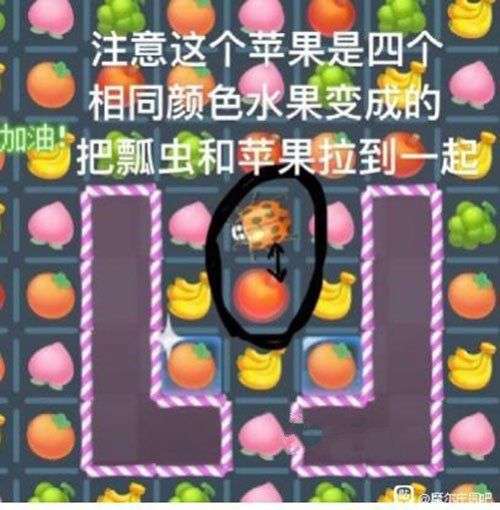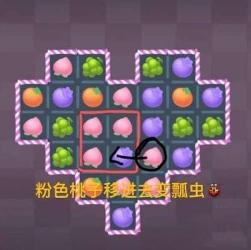 首先要找如图的4个水果,凑成一个田字格(任何一种水果都行,只要能凑成田字格),就会变成瓢虫。