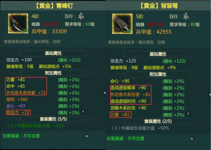 比方说你本身是木系职业,你有紫色暗器兵甲值很高,五行也是正确的,但是它的词条全是格挡、体质;你有蓝色暗器,兵甲值低一些,但是它的词条是力量、外功木系伤害等输出词条,这时候不要在意兵甲值高低,一定要带词条正确的武器。