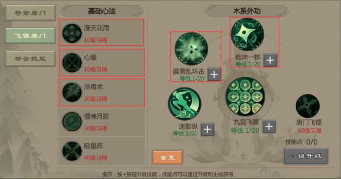飞镖唐门属于群攻强力输出职业,所以技能优先点:
