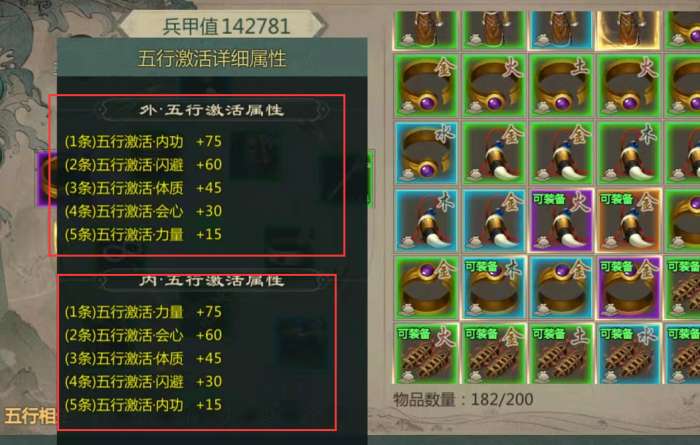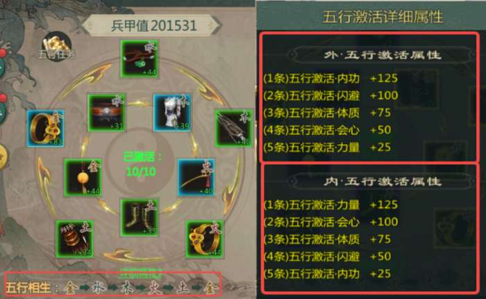 不要过分追求兵甲值的高低!兵甲值高低不等于实战能力,优先考虑五行是正确的配置,哪怕是为了激活五行,兵甲值有降低,也是正确做法的。