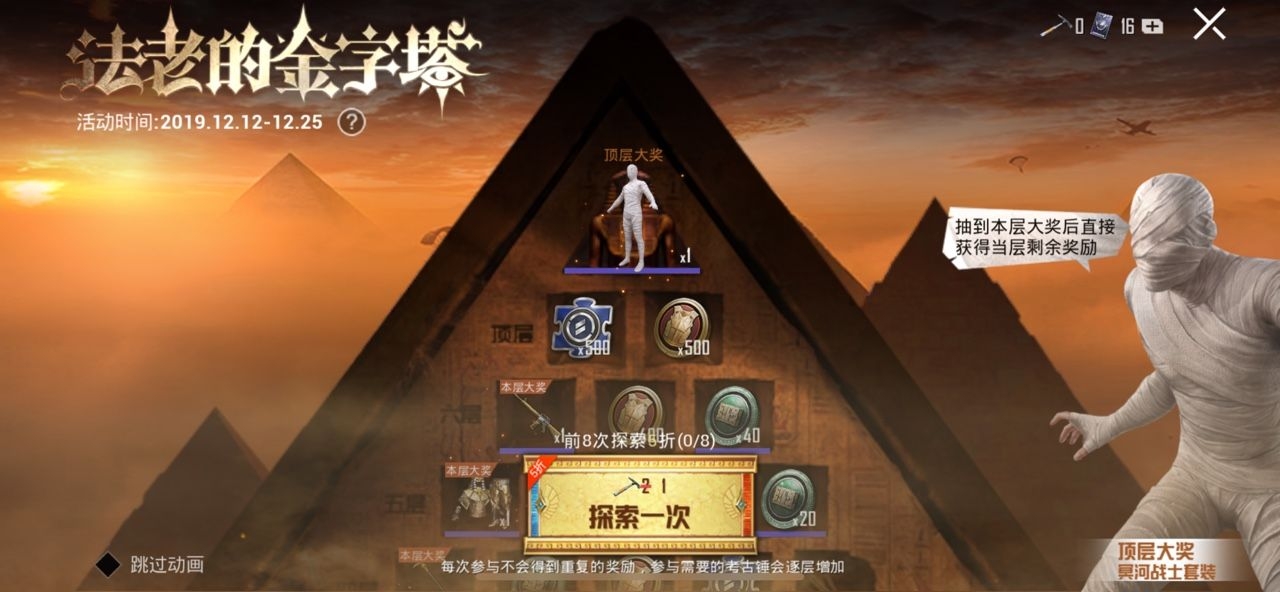 2.“金字塔一共7层,每层有一个大奖,探索到当层大奖后将往上升一层进行探索,同时获得本层未获得的剩余奖励。