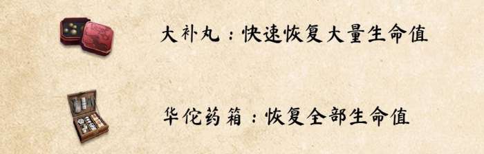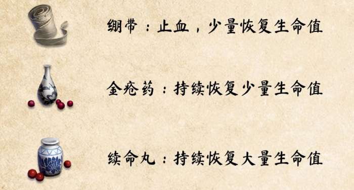 绷带使用时间为1秒,恢复少量;金疮药服用时间1秒,持续恢复少量;续命丸服用时间2秒,持续恢复大量。建议各携带6个左右。