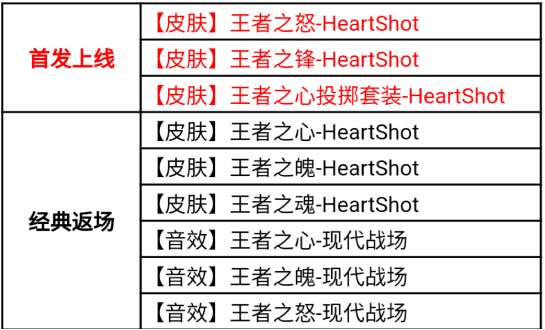 哦对了,其中王者之怒-HeartShot、王者之锋-HeartShot,以及王者之心投掷套装的HeartShot都是首次发售,这些高品质“拉丝”皮肤具有全新特效外观、专属击杀图标、 炫酷消灭特效等诸多特权,后续我们会为大家详细展示。