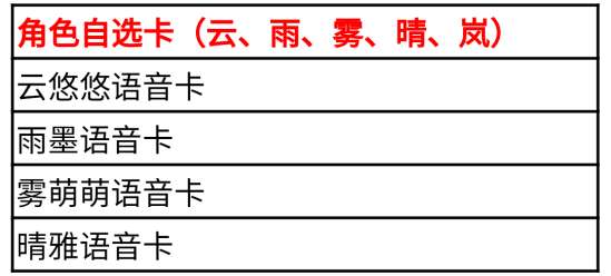 此外,奖池中还有一张HeartShot女神自选卡,获得此卡的CFer,可以从云悠悠、雨墨、雾萌萌、晴雅、岚兮儿之中任选其一。而且除了岚兮儿以外,另外四位电竞女神的语音卡也都会加入该活动的奖池。