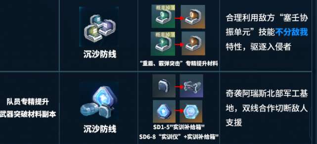 另外玩家还可以去关注深红武装副本,这里就是培养武器的所在之地。主要的获取材料就是武器兑换币,还有模组数据单元以及活性合金锻料。前两者是更换武器,还有刷模主词条的关键,后者就是工程职业在提升专精时的必要材料。想要给队伍配强力的武器,想要养医疗队员,那这个副本必须要刷满。接着就是职业专精材料本产出完全是对应自己的职业,所以千万不要搞混合。靶向支援副本就可以获得影刃职业,还有冲锋突击职业的专精提升材料。