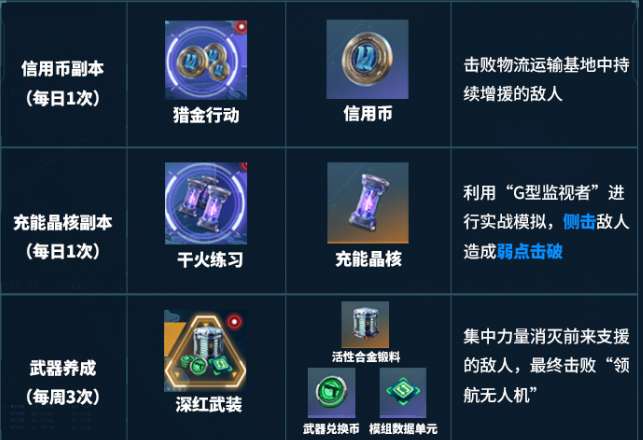 还有两个特殊的副本,一个就是猎金行动,产出物就是充能晶核,还有信用币。相当于打一次副本就可以拿到两个日常副本的核心资源,要是哪一天忘记打也可以选择补回来,效率还是比较高的。阿瑞斯北部军工基地的玩法也并不单调,组队配合去打更加的有意思。另外一个就是实训材料副本,也会分成两个阶段产出的会有所区别,一个可以获得实训补给箱,另外一个就可以获得实训仪。这就是一个关键的道具,在后期养成的时候是不可以缺少的,所以一定要选择优先的刷取满。