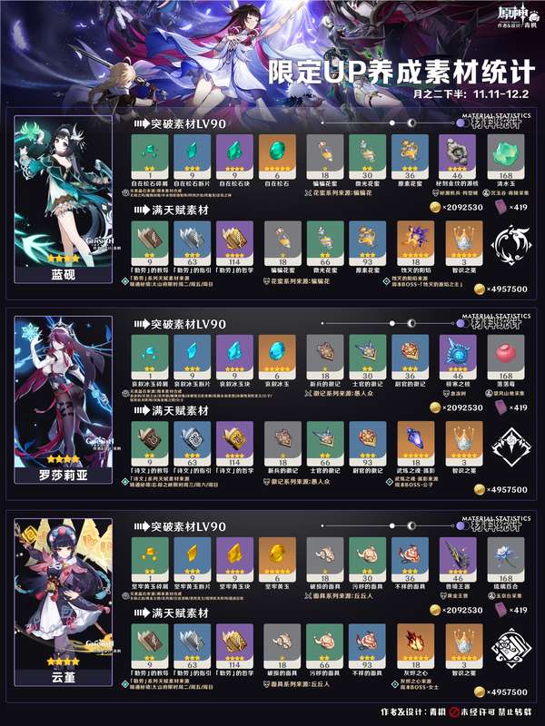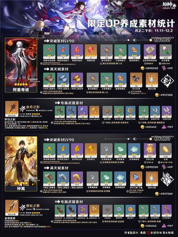本期为大家带来月之二版本UP角色&武器的养成耗材统计,有养成需求的旅行者们可以提前准备相关素材了,新版本祝福大家抽卡不歪,好运连连喔~!