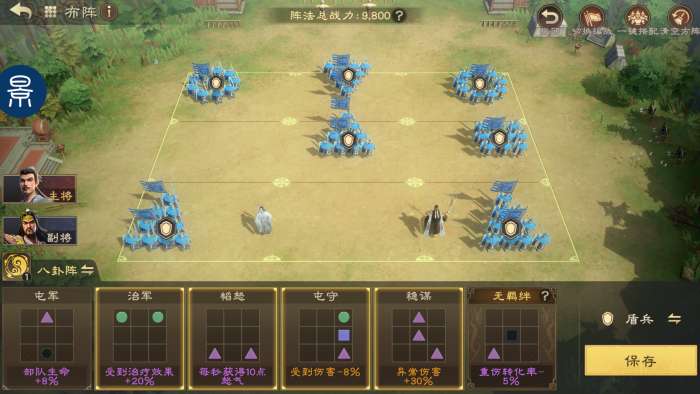 异常队首选八卦阵,八卦阵在普攻时可附加灼烧,与诸葛亮灼烧附加联动,可保证灼烧高频覆盖,阵型推荐选择稳谋、屯守、韬怒、治军/屯军。