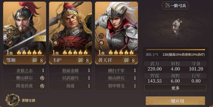 阵容方面,鄂顺的选择非常灵活。这里以庚金阵容为例,韦护+鄂顺+闻仲/晁雷/黄天祥组庚金骑。韦护主将提升全队武力伤害,并打出极致爆发。此时鄂顺刚需见龙在田+巧夺灵魄,不断触发被动叠层易伤和利刃,提升全队武力伤害。闻仲/晁雷辅助庚金叠层,带黄天祥主要是提升阵容火力。