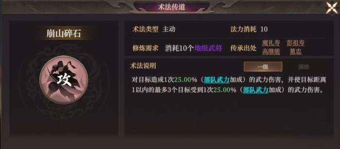 术法除了上面说的两个刚需,椎锋陷陈(附加流血)、崩山碎石和攻城掠地(降低敌方守备)和醍醐灌顶都是不错的选择。