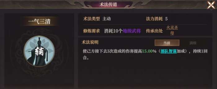 火灵圣母,燃烧弓核心。自带术法对最多5队造成智谋伤害并挂燃烧效果。此时再发动灵宝,可对最多6个目标造成高额伤害,且对挂上点燃的目标造成二次伤害。传道术法【一气三清】满级让己方接下来的3次伤害提升30%,增伤效果优秀,适合打多段伤害的爆发型大C。