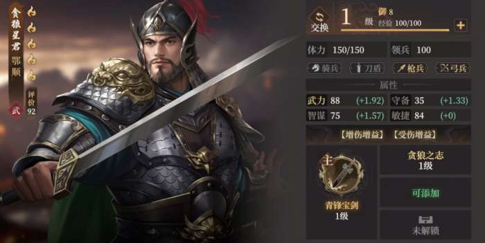 主动术法【贪狼之志】,己方队伍每次发动追击或主动类技能,都有概率获得一层利刃,目标队伍概率获得一层易伤。优点是一旦同时触发两种效果(尤其是在连击体系中),武力增伤的幅度会非常大。缺点是触发效果需要发动技能,跟赵公明、苏全忠等普攻/造成伤害就能施加状态的武将相比,鄂顺叠层速度相对较慢。满级30%的独立判定概率也不如前者稳定。