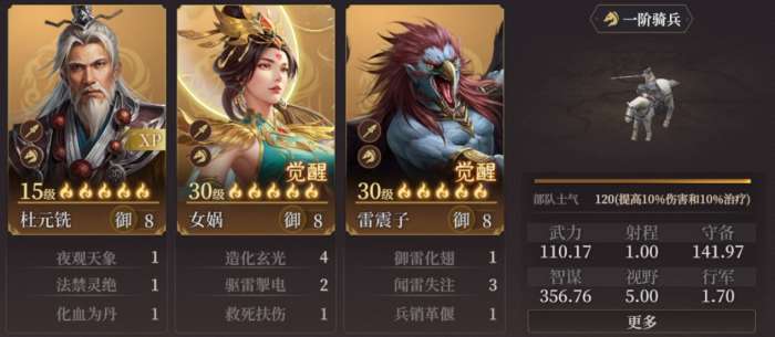 阵容部分,最常规的就是替换掉姬昌,封神枪改带骑兵。杜元铣和女娲的机制类似,只不过高额AOE伤害换成了智谋增伤。而且减伤换成了提高守备。考虑到新赛季出现了“无视守备造成伤害”的术法机制,个人更倾向于女娲来当主将。