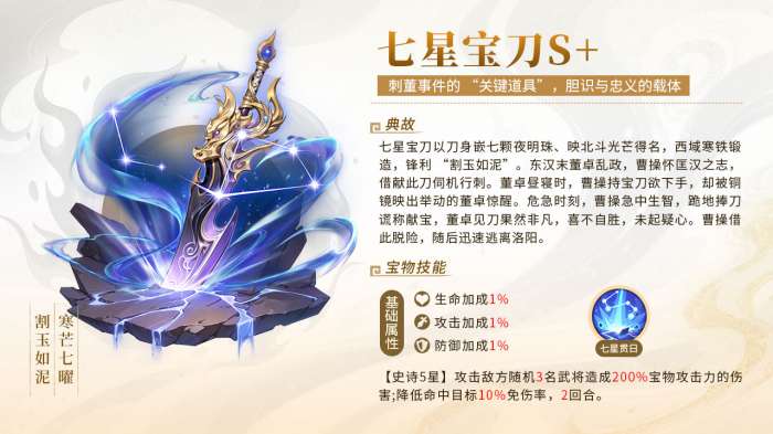 同为s+品质的七星宝刀则是战斗型武将的首选。这件阵营宝物是曹操刺董事件中的关键道具,是胆识与忠义的现实化身。装备他的武将同样可以获得1%的基础属性加成,并开启名为“七星贯日”的强力伤害技能。该技能能够使敌方随机三名武将受到200%的宝物攻击力伤害,是一个十分强力的群攻技能。如果宝物等级够高的话,能够在对局中实现快速的血线压制和斩杀。同时,此宝物能够使敌方的免伤率在两回合内降低10%,让武将们能够更快的出伤。此外还有传国玉玺、七星灯等宝物,高度匹配以防御和治疗为主的武将,用处颇多。