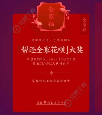 “全家福”卡是在所有可以集福卡的地方,都有可能出现全家福,拥有全家福有机会抽取“帮还全家花呗”大奖,在1月24日21:20开奖,大奖共888份。