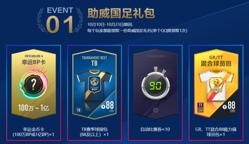 10月10日-10月23日期间,每个玩家都能领取一份助威国足礼包(单个QQ限领取1次)