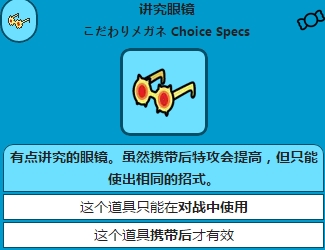 1、携带该道具的宝可梦的特攻提升50%,但只能使用上场后使出的第一个招式。